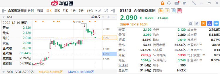 12月19日讯,配售消息披露后,合景泰富(01813)盘初低开后跌约13%。公司拟先旧后新配售2.35亿股,相当于已发行股本约7.38%;每股作价2.01港元,较最新收报折让14.83%;所得净额4.67亿元。截至发稿,合景泰富跌11.44%,报2.09港元,成交额5.63亿港元。
