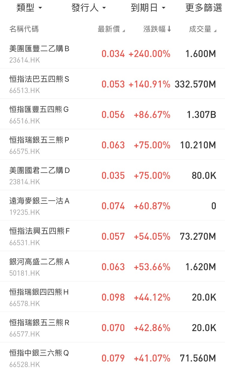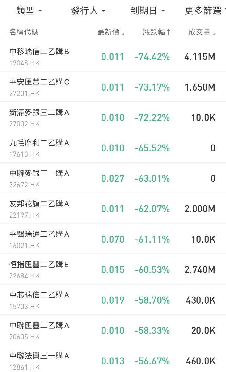 在今日跌幅榜中,中移瑞信二乙购B $19048.HK 跌74.42%,平安汇丰二乙购C $27201.HK 跌73.17%,友邦花旗二乙购A $22197.HK 跌62.07%。