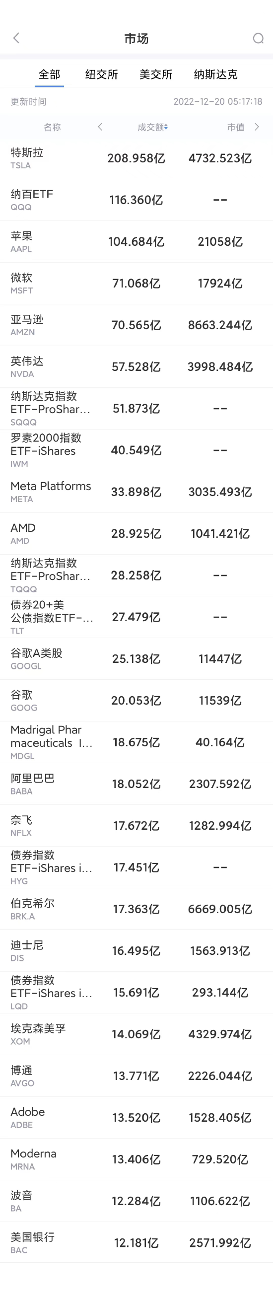 以下为美股当日交易最活跃的20只股票(按成交额):