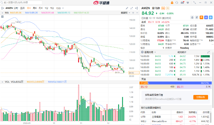 美国电商巨头亚马逊的股价已经回吐了新冠病毒大流行带来的所有涨幅,跌回了疫情前水平。截至周一美股收盘,该股下跌3.35%,至84.92美元,为2020年3月16日以来的最低收盘价,今年迄今的跌幅已超50%。
