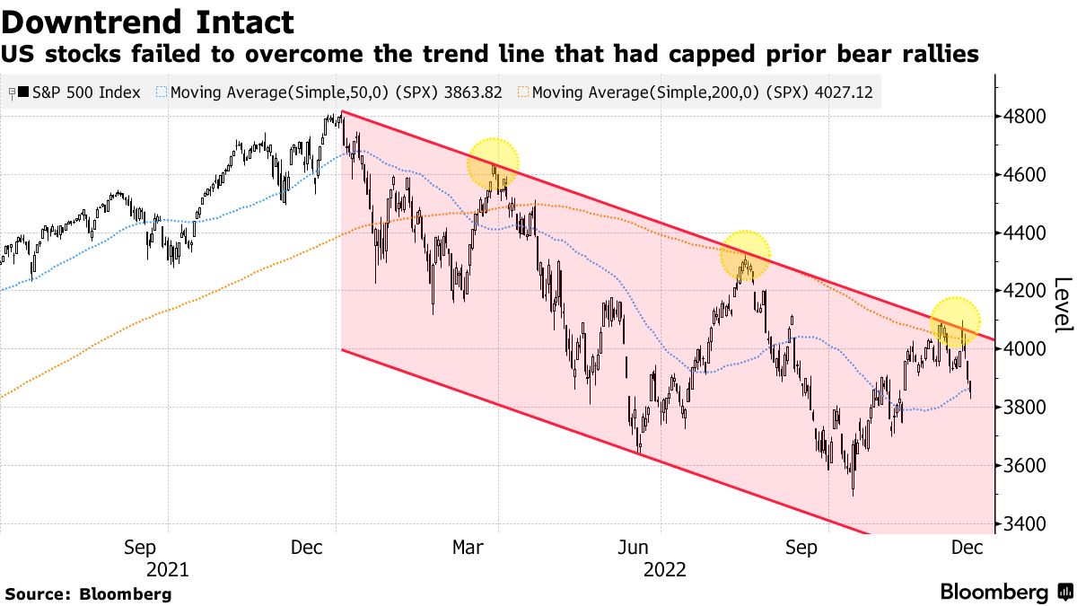 美国股市过去3次反弹都未能突破今年初以来的技术性下跌趋势,而上周低于预期的CPI数据公布之后,股市一度高开,但是同样未能突破该关键阻力。