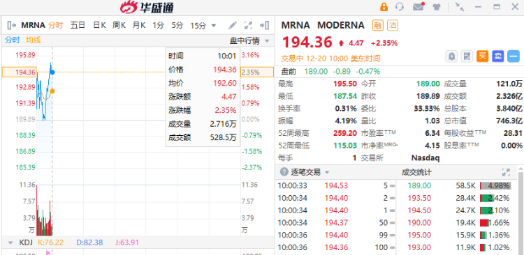 莫德纳 $MRNA 涨超2%,在公司的癌症疫苗二期试验给出了积极的结果后,杰富瑞分析师Michael Yee将公司的评级从“持有”上调至“买入”,同时将目标价从170美元大幅上调至275美元。
