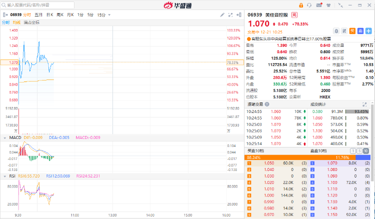 华盛资讯12月21日消息,美佳音控股早盘飙升115%,盘中高见1.39港元创2021年9月份以来新高。截至发稿,涨78.33%,报1.07港元,成交额5995万港元。