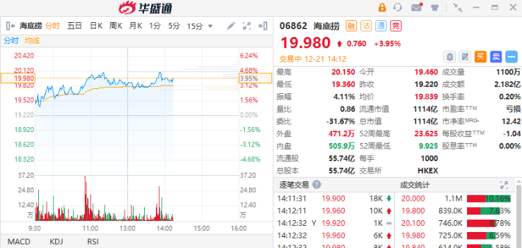 华盛资讯12月21日消息,餐饮旅游股多数回温上升。餐饮股方面,截至发稿,海底捞涨近4%,九毛九涨近3%,周黑鸭、奈雪、呷哺呷哺涨超2%,谭仔国际涨超1%。