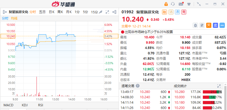 酒店旅游股方面,国家联合资源涨近10%,复星旅游文化涨超3%,携程集团涨近3%,同程旅行、中国中免涨近2%。