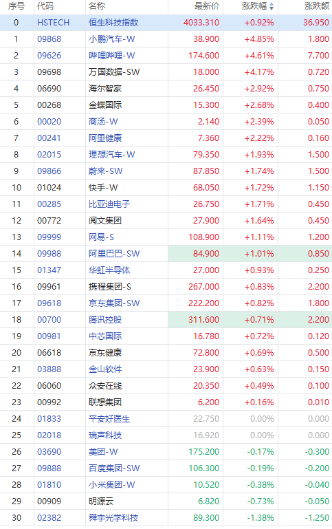 科网股多数上扬,哔哩哔哩-W涨近5%,快手-W涨近2%,网易、阿里巴巴-SW涨超1%,京东、腾讯控股涨近1%。