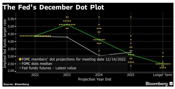 美联储官员上周将利率上调了0.5个百分点,使基准利率达到4.25%至4.5%的目标区间。他们还发布了预测,根据他们的预测中值,明年结束时的利率为5.1%,2024年之前不会降息。
