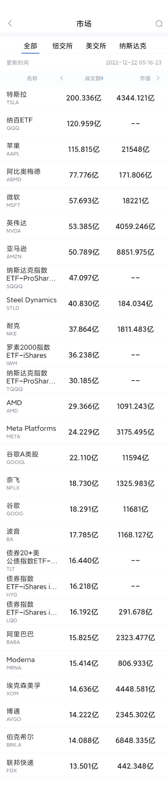 周三美股成交额冠军特斯拉收跌0.17%,成交200.3亿美元。特斯拉将暂停招聘并进行新一轮裁员。马斯克称将在找到继任者后辞去推特CEO。他称,推特有望在明年实现约30亿美元的收入,其资产负债表上有约10亿美元现金。这一收入规模比2021年少了大约20亿美元,主要是广告主逃离造成的。但推特的支出将达到约50亿美元。他认为推特明年会好起来的,公司明年将大致达到现金流收支平衡。