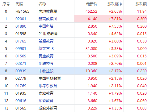 华盛资讯12月22日消息,港股内地教育股早盘走高。截至发稿,新高教集团、中国科培近8%,21世纪教育涨超4%,希望教育、新东方-S、民生教育涨超3%,创联控股、中教控股、中国新华教育、思考乐教育涨超2%,东软教育等涨超1%。
