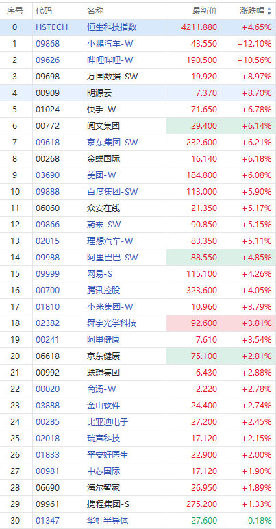 科网股全线走强,哔哩哔哩-W涨逾10%,快手-W涨近7%,京东集团-W、美团-W涨超6%,百度涨近6%,阿里巴巴-SW、网易、腾讯涨超4%,小米集团-W涨超3%。