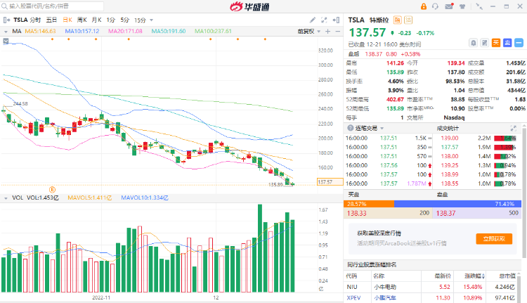 截至周三收盘,特斯拉股价报收于137.57美元,创下两年来的低点。随着较高的利率环境导致科技股重挫,特斯拉股价今年累计下跌逾60%。此外,特斯拉投资者也越来越担心,在马斯克接管推特后,他的注意力会被分散。