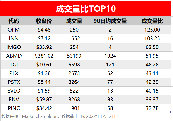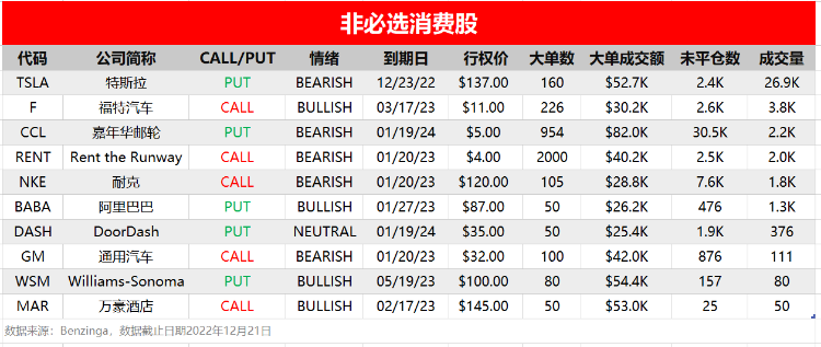 周三(12月21日),非必选消费、信息技术和通讯服务板块相关个股出现较多活跃单,按照当日成交量排行,榜单TOP分别如下: