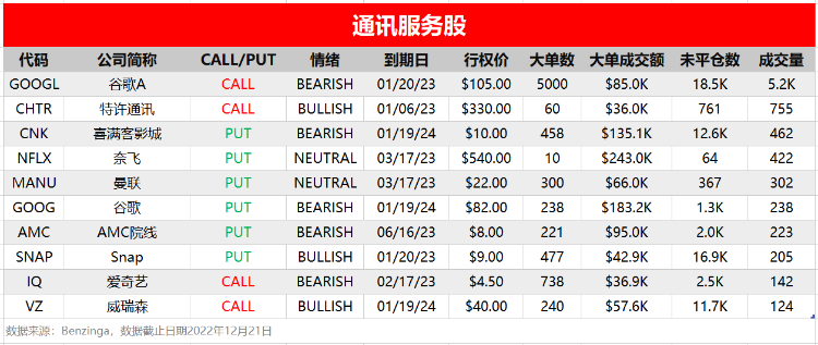 - 奈飞现看跌期权异动大单,成交总金额24.3万美元,沽购比升至1.71的高点,前值1.21。据外媒报道,微软将在2023年继续进行收购业务,并将奈飞纳入收购“愿望清单”之中。