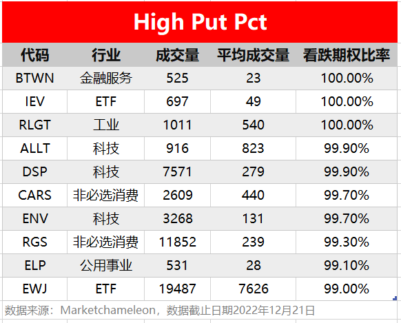 - 当日Put单比率达到100%的个股为3只。金融股BTWN $BTWN 、欧洲ETF $IEV 和物流企业RLGT $RLGT 的看跌期权比率100%。