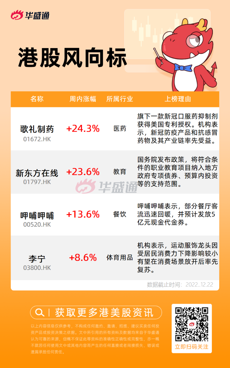 港股风向标 | “吃药”行情再燃!歌礼制药周内飙升24%,职教利好加码新东方大涨