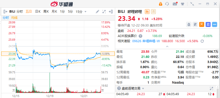 华盛资讯12月22日消息,美股盘前中概股走高,美物科技涨13%, 高途涨近6%,哔哩哔哩涨近4%,贝壳涨超3%,理想汽车、新东方教育、阿里巴巴、拼多多涨超2%,蔚来、好未来、百度涨近2%,腾讯音乐、知乎涨超1%。