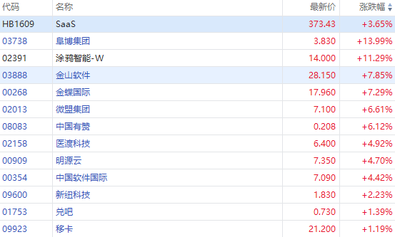 华盛资讯1月3日消息,港股SaaS概念股午后持续走高。截至发稿,阜博集团涨14%,涂鸦智能-W涨超11%,金蝶国际、金山软件涨超7%,微盟集团、中国有赞等皆涨超6%。