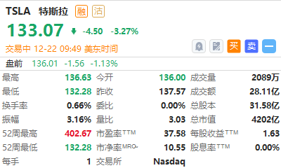 特斯拉跌超3%,现报133.07美元。需求阴云笼罩明年,德银下调特斯拉Q4交付量预期。