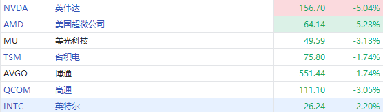 半导体板块集体下挫,美国超微公司、英伟达跌超5%,高通、美光科技跌超3%,台积电跌超1%。消息面上,美光科技公布了黯淡的财报,第一财季营收同比下降47%至40.85亿美元,预计第二季度经调整营收36亿美元至40亿美元。