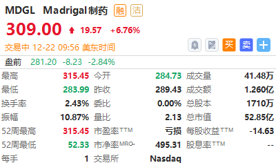 Madrigal制药逆市涨近7%,现报309美元。此前公司宣布针对肝脏定向选择性甲状腺激素受体激动剂Resmetirom的关键3期MAESTRO-NASH临床试验达到积极顶线结果。
