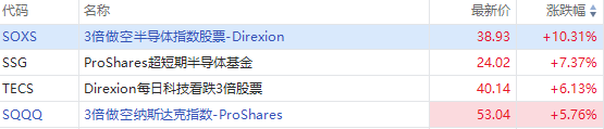 做空类ETF大涨,3倍做空半导体指数股票-Direxion $SOXS 涨超10%,3倍做空纳斯达克指数-ProShares $SQQQ 涨超5%。
