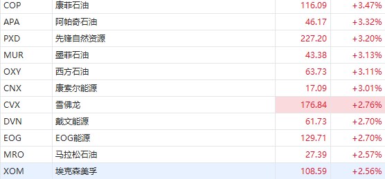 油气股集体拉升,康菲石油、墨菲石油、西方石油涨超3%,雪佛龙、埃克森美孚、戴文能源等涨超2%。消息面上,俄罗斯副总理亚历山大·诺瓦克周五表示,该国可能会在2023年初削减5%-7%的石油产量,以应对西方针对俄原油和石油产品实施的价格上限措施。