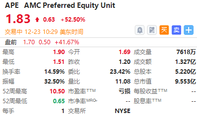 AMC优先股 $APE 涨52.5%,现报1.83美元。AMC院线跌超5%,现报4.49美元。AMC院线表示,计划通过以每股66美分的加权平均价,向Antara Capital LP出售其APE(AMC的优先股)来筹集新资金。公司还提议,按1比10的比例对AMC普通股进行反向拆股。公司要求召开特别股东会议,批准反向拆股,并将APE转换成AMC普通股。