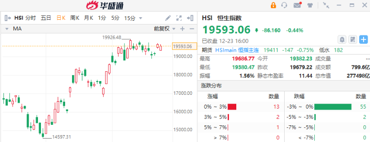 12月上旬,恒生指数点位在2021年7月以来首次接触到200日均线(MA200),随后增势放缓。目前,恒生指数在MA200附近震荡的状态已经维持2周有余,但仍然未能稳定地向上突破MA200。