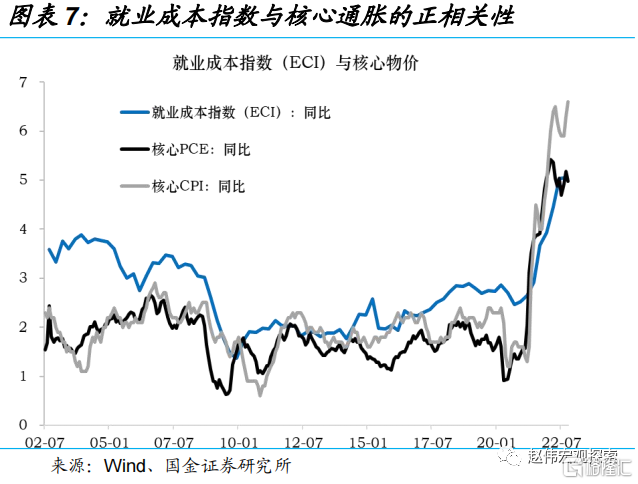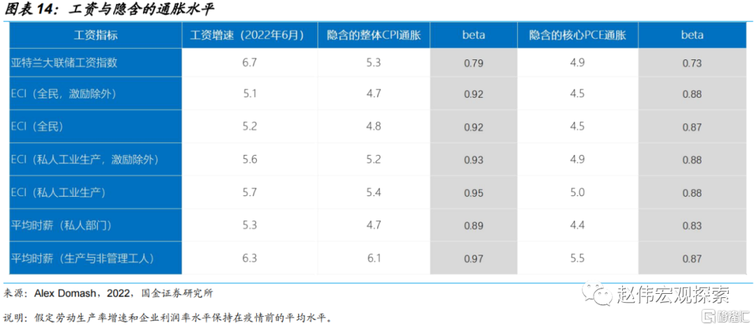 根据菲利普斯曲线的关系,工资和通胀之间存在一定的转换关系,但不同指标之间存在一定差异。工资和整体CPI通胀的转换系数为0.79-0.97,与核心PCE通胀的转换系数为0.73-0.87。6月为美国工资增长的高峰期,各工资指标对应的CPI和核心PCE通胀率如下表所示。虽然工资增速已经放缓,但较难回到疫情前的低位。假设就业成本指数(ECI)的涨幅稳定在4%(2019年底为2.6%),隐含的整体CPI通胀约为3.6%,隐含的核心PCE通胀约为3.3%。