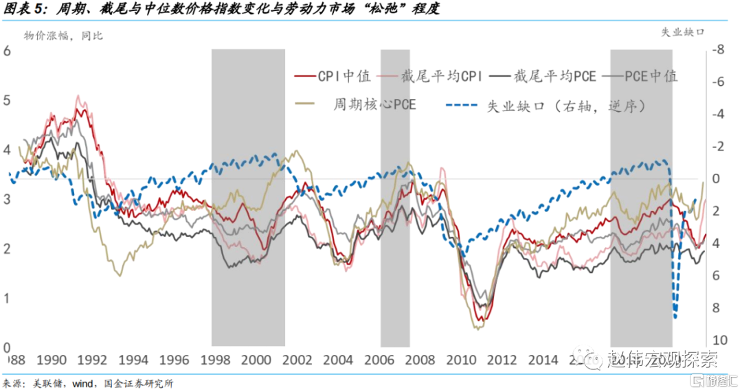 美国的经验显示,通胀的中期趋势取决于工资水平,而工资又取决于“失业缺口”,即劳动力市场的“松弛”程度。该问题的本质是“菲利普斯曲线”有没有消失?上世纪90年代以来,在全球范围内,传统菲利普斯曲线的平坦化并无争议,即物价对劳动力市场的“松弛”程度不再敏感。但也有证据发现,如果在中周期内考察通胀和劳动力市场的关系,或者只选取通胀中的周期敏感性的部分,菲利普斯曲线并未消失。美国趋势性通胀指标(CPI中值、截尾平均通胀等)与失业缺口的正相关性依然成立。