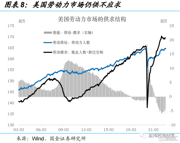 美国至今仍有近500万劳动力缺口,较3月的峰值下降了100万。每个失业者对应的空缺岗位数仍高达1.6-1.7,低于峰值(2),但高于疫情之前的水平(1.2)。并且,劳动缺口具有长期性。一方面,受疫情影响,美国提前退休人数增加了近200万,导致劳动参与率比疫情前低0.8个百分点。受特朗普政府移民政策的影响,2017年来累计减少的移民人数约300万。