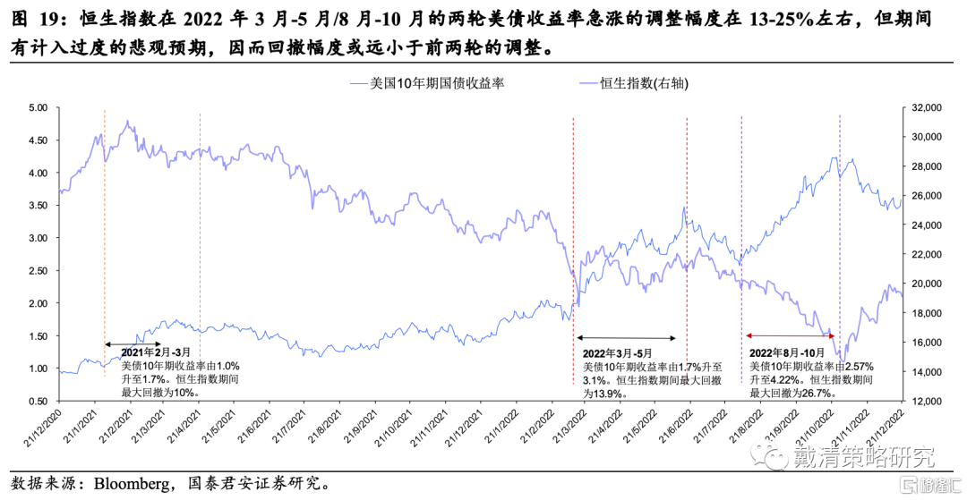 港股受美债利率上升或有所调整,但幅度上相对有限。根据美股调整的幅度来看,美债收益率上涨10个基点,或对应1%的跌幅,但当美债利率上升遇到中国经济复苏,港股方向将与复苏保持一致。随着中国政策端的持续发力,中国经济有望在2023年重回弱复苏,从而与美国形成错位,而美联储加息和美债利率上升的影响将会有所减弱。