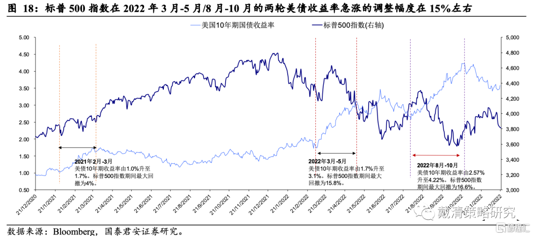 从2022年美债收益率两轮快速上涨的周期内,3-5月,10年期美债收益率涨超140基点,而8-10月涨超160基点,标普调整的幅度在15%左右。因此,通过简单的线性外推,不考虑其他因素的影响下,美债10年期利率上涨10个基点,对应造成标普500指数近1%的跌幅。