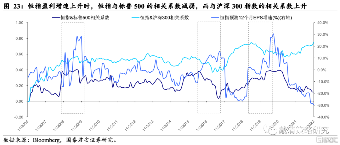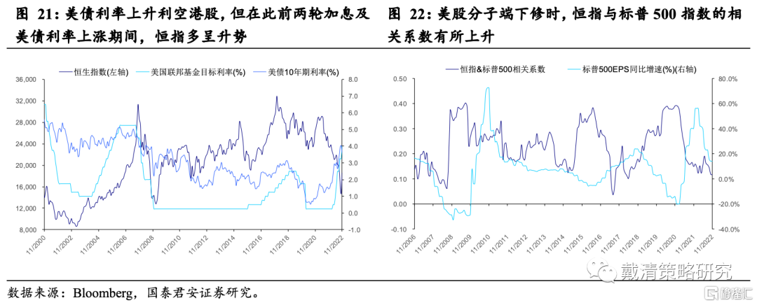 当美债利率上升遇到中国经济复苏,港股方向将与复苏保持一致。港股在本轮加息前的此前两轮加息(2016-18、2004-06)及美债利率上涨期间,恒指多呈升势,核心原因在于其盈利增速正在向上。同时,在恒指盈利增速向上期间,恒指与标普500的相关系数减弱,而与沪深300指数的相关系数上升。因此,随着中国政策端的持续发力,中国经济有望在2023年重回弱复苏,从而或与美国形成错位,而美联储加息和美债利率上升的影响因素将会有所减弱。
