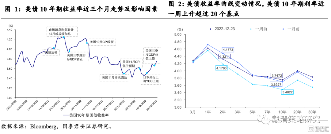 日本央行调整YCC上限,美债10年期利率跟随上移。日本央行在12月20日意外调整YCC上限,带动了美债收益率的同步上移。日本10年期国债收益率的上升有望推动日本投资者将资金从海外,特别是当前已有一定流动性风险的美债市场等回流日本国内,或将加速美债抛售,从而抬升美债收益率中枢。日本央行调整YCC上限后,美债10年收益率迅速上行超过10个基点,相关风险因素已被市场计价。
