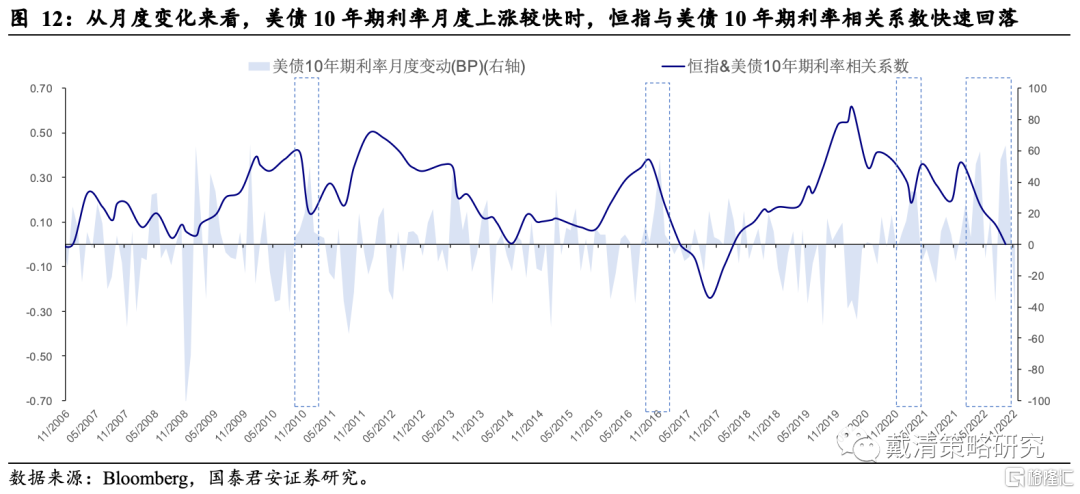 若股指或企业的盈利增速下行或转负阶段,而美债10年期收益率快速上升时,估值快速承压仍将导致股市下跌,而该阶段恒指与美债10年期收益率相关系数快速下降,甚至转负。美债10年期收益率作为无风险利率,主要影响恒指的估值端,即美债10年期收益率上涨时,意味着无风险利率上升,股指或上市企业的折现的未来现金流减少,从而造成股市下跌。但这一关系不是必然的,如果股指或者企业的盈利增速快于无风险利率抬升时,股指和企业仍然会上涨。相反,若股指或企业的盈利增速下行或转负阶段,则当美债10年期收益率快速上升时,估值快速承压仍导致股市下跌,而该阶段恒指与美债10年期收益率相关系数往往快速下降,甚至转负。