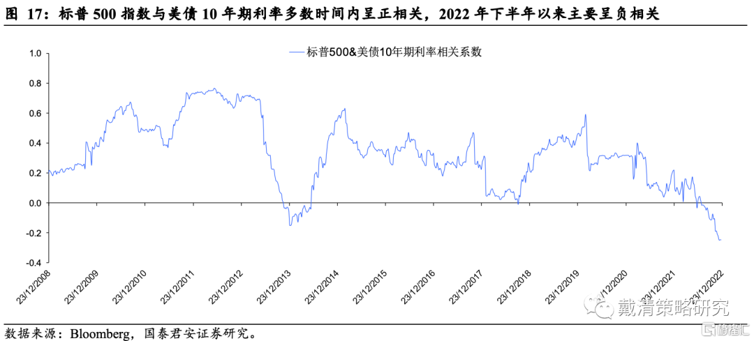 2022年下半年以来,随着美股盈利增速逐渐回落,且在美联储激进加息的带动下,美债10年期收益率中枢快速抬升,标普500与美债10年期利率相关关系转负。美股2022年下半年来的调整主要来自分母端压力。由于美债10年期收益率对美股分母端的影响与港股相同。同时,标普500指数与美债10年期利率的相关系数走势也与港股恒指具有一定的相似之处。因此,我们可以通过美债10年期利率上升对美股的冲击,来估计美债10年期利率上升对港股恒指的影响。