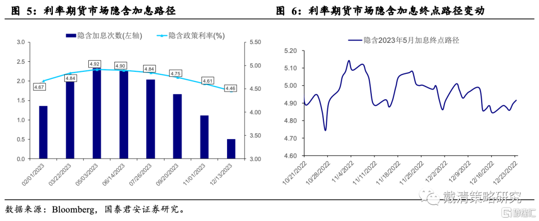市场预期或再度修正,从而继续推动美债收益率回补此前跌幅。美联储12月FOMC会议后,市场关于加息终点的分歧加剧。美国三季度GDP终值公布前,市场隐含的终端利率在4.87%左右,即在当前的利率加息不到50基点即可完成,但美联储12月会议的预测中值为5.1%,显然市场认为在通胀趋势回落,经济陷入衰退的预期下,美联储或许不需要更大幅度的加息,但是当前强劲经济数据或造成市场预期再度修正,从而继续推动美债收益率回补此前跌幅。