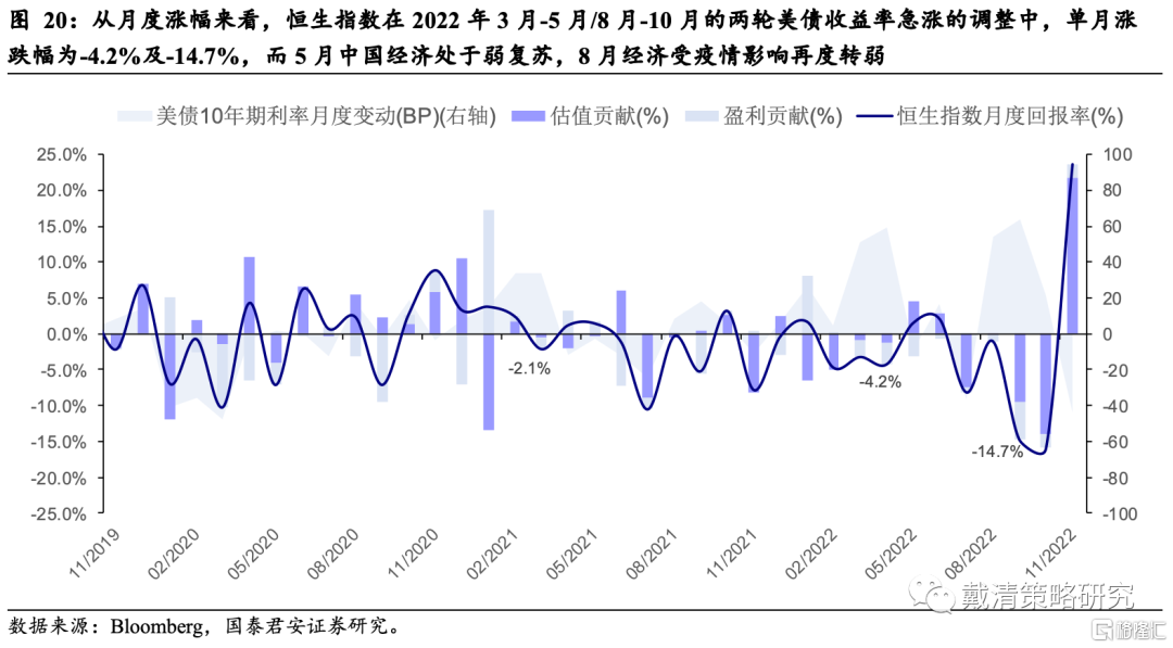 现阶段,政策底已经确认,市场正在等待业绩底的出现。掣肘港股的不确定性因素已有所消除,因而此轮美债收益率的上涨预计对港股的调整幅度或有限。在2022年3-5月以及8-10月,美债收益率两轮快速上冲时期,港股跟随海外均有一定程度的调整,但期间港股的回调也计入了疫情反复等利空因素。根据美股调整的幅度来看,美债收益率上涨10个基点,或对应1%的跌幅。而从月度涨幅来看,恒生指数在2022年3月-5月/8月-10月的两轮美债收益率急涨的调整中,单月涨跌幅为-4.2%及-14.7%。2022年5月中国经济处于弱复苏中,经济景气度有所上行,尽管美债收益率急升,分母端承压相对较小;而8月中国经济受疫情影响,景气度有所回落,分母端压力则再度上升。
