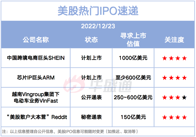 以上即为预计本周上市的四只新股。美股周一(12月26日)因圣诞节休市一日,接下来还有新年假期,市场整体较为清淡,近期预计上市的新股消息不多。回看2022年,美股IPO发行疲软,跨境电商巨头Shein、芯片IP巨头ARM等上市计划迟迟未定。展望2023,这些重磅IPO有望如期而至吗?