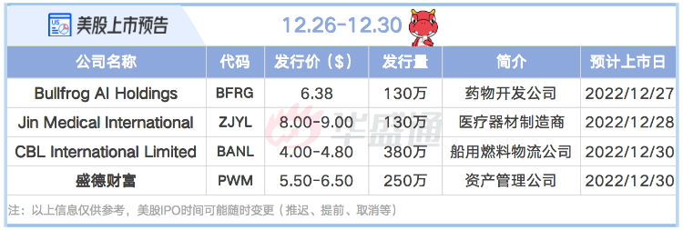 本周IPO市场,截至目前,暂时预计将迎来4只新股挂牌,药物开发商Bullfrog AI Holdings、香港资产管理公司盛德财富等预计将在周内先后登陆美股市场。需要注意的是,美股IPO时间可能随时变更(包括提前、延后等),投资者需持续跟进相关消息。