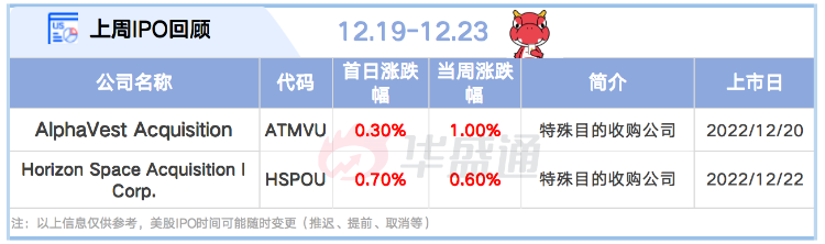 上周值圣诞节前夕,美股IPO市场较为清淡,共计两家SPAC公司AlphaVest Acquisition和Horizon Space Acquisition I Corp.新挂牌,首日均仅小幅波动。