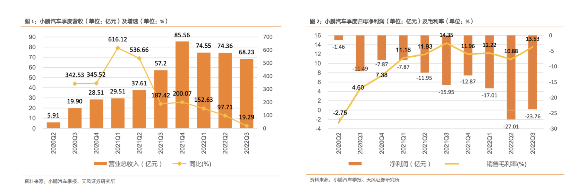 来自天风证券的研究则显示,伴随增速放缓,小鹏汽车的营收已出现连续多个季度下滑,同时亏损幅度也有所增加。