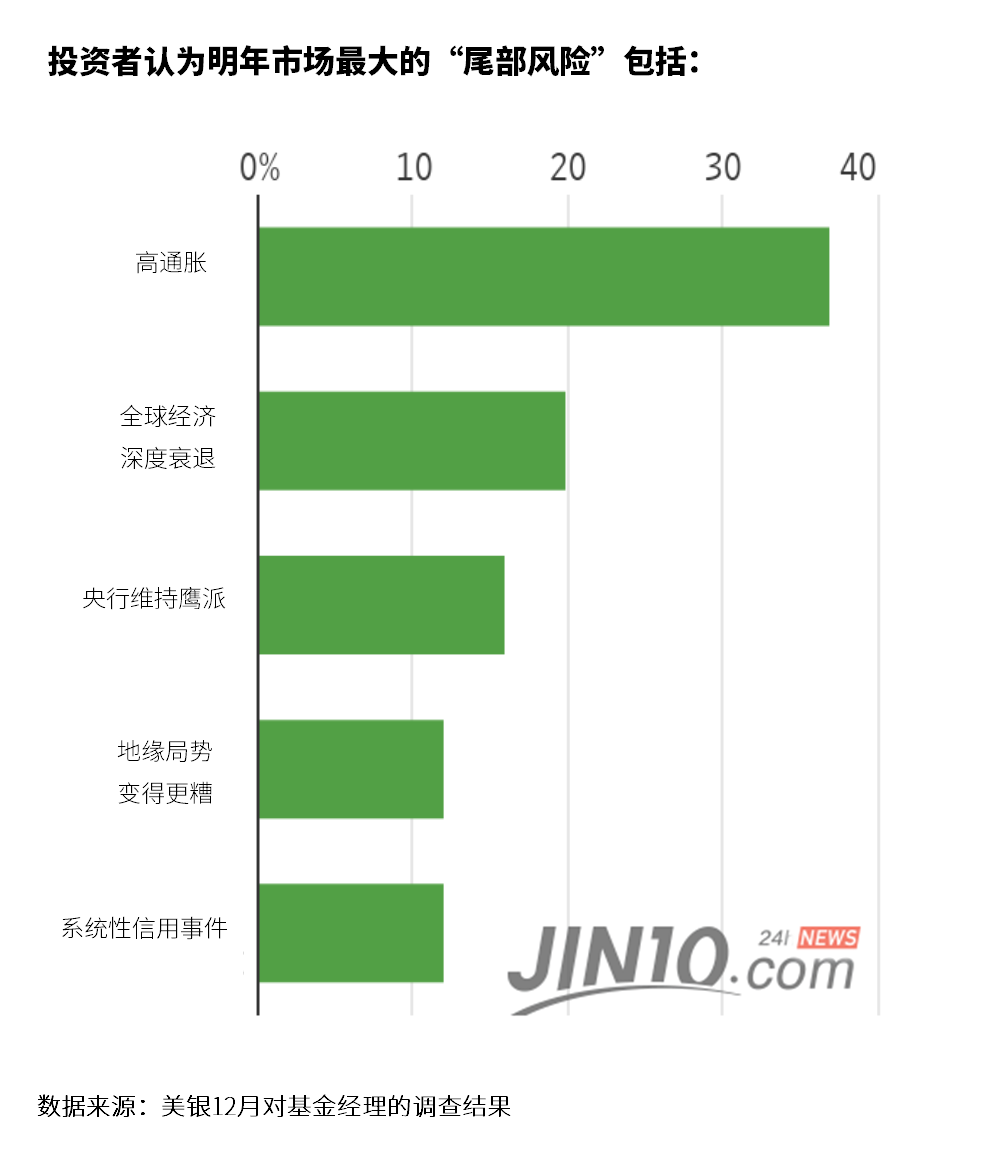 接受美国银行调查的基金经理表示,高通胀是市场的头号“尾部风险”,其次是全球经济深度衰退和央行保持紧缩货币政策。所谓的尾部风险,通常是投资者认为不太可能发生的负面事件。