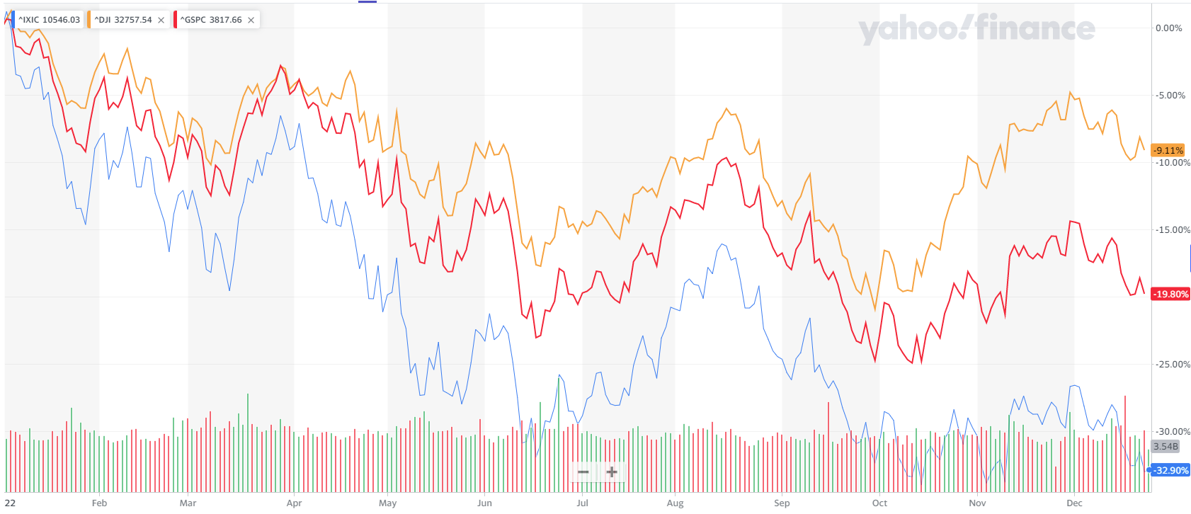 如果你在2022年投资了科技股,那么现在很可能正处于亏损状态。聚焦科技股的纳斯达克指数今年累计跌约33%,在美股三大指数当中领跌(标普500指数累跌逾19%,道指累跌约9%)。今年即便是大型科技股也未能摆脱下跌,如苹果、谷歌A今年分别累跌25.36%、38.4%。