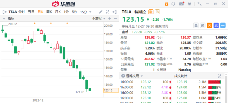 12月至今,特斯拉累计已跌36.75%,全年累计跌逾65%。根据S3 Partners的数据,截至12月21日的一个月时间里,特斯拉空头头寸新增逾5亿美元。