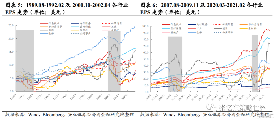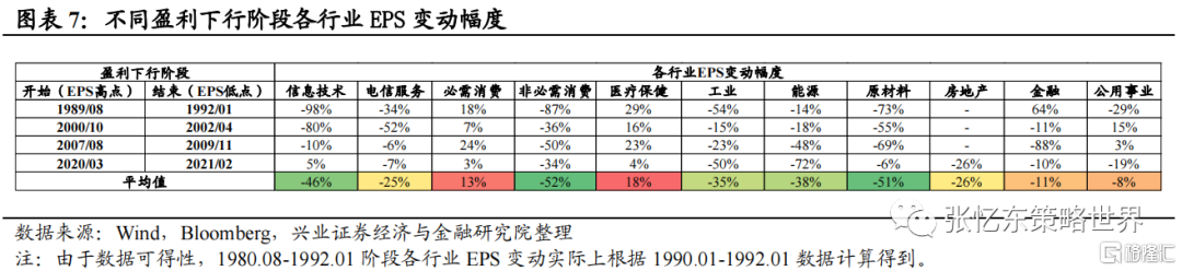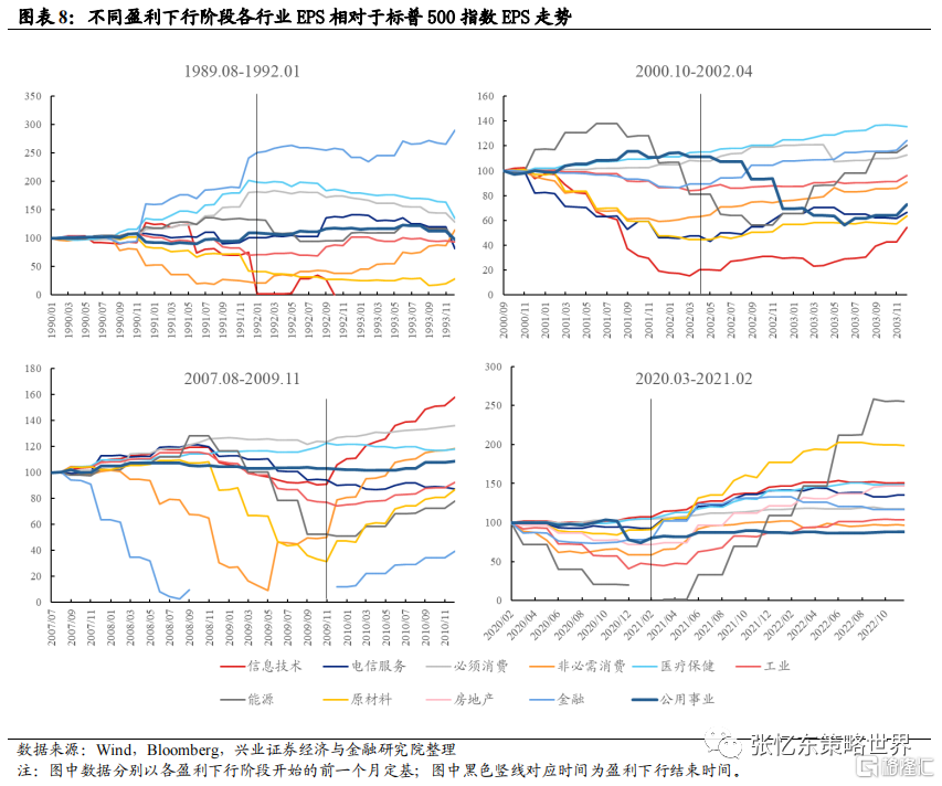由于数据可得性,我们统计了1990年以来的4轮盈利下行期,标普500各行业指数EPS特征。