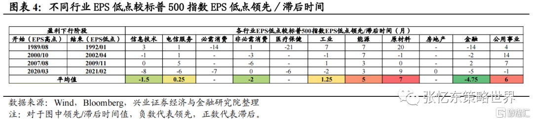 周期行业能源、原材料,以及公用事业EPS低点出现的时间往往滞后标普500指数EPS低点约半年时间。