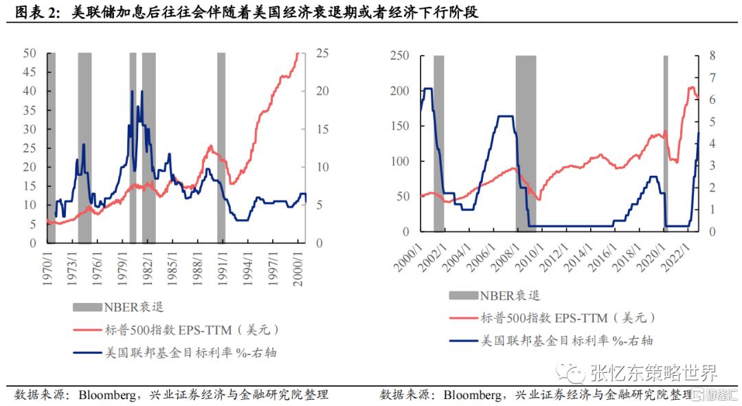此外,美国经济下行往往与加息周期相关,根据加息周期后是否陷入NBER衰退期,可以将美国经济分为软着陆和硬着陆。1970年以来,美国软着陆只发生在两次加息周期后,分别是1983-1984年加息周期、1994-1995年加息周期。但即使是软着陆,1983-1984年的加息周期也带来了标普500指数1985-1987年的盈利下行。而1994-1995年加息周期既没有导致经济衰退也未引发盈利下行,主要是由于对经济过热引发通胀的预期使得1994年提前加息,成功抑制通胀;且当时全球化及互联网快速发展,支撑经济高景气。