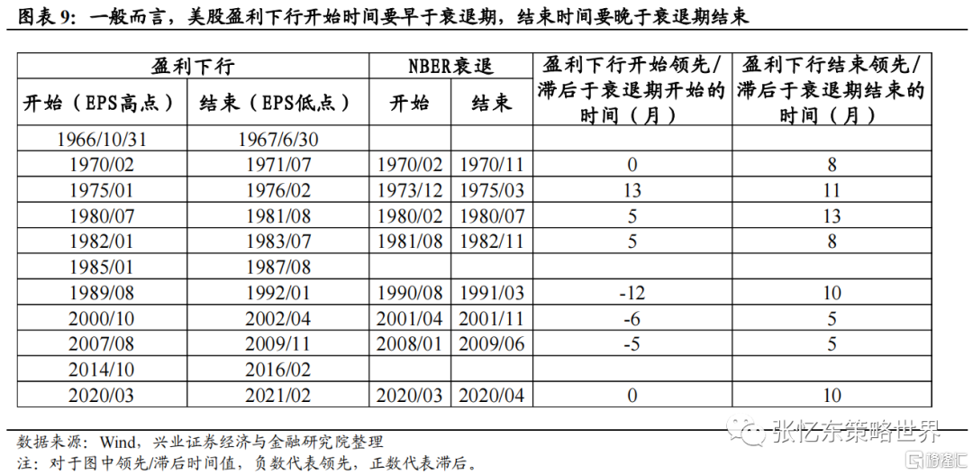 美股盈利下行开始时间往往早于经济衰退,结束时间晚于经济衰退;而美股行情低点领先于衰退期结束和EPS见底